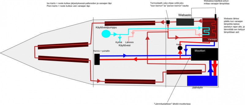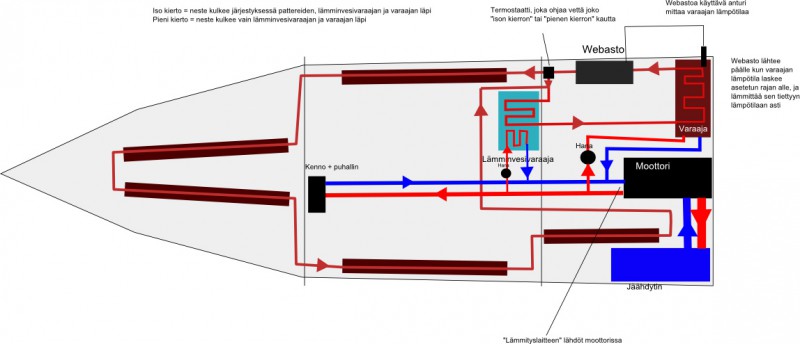 Onkos tässä mitään järkeä   Tuossa siis kaksi nestekiertoa. 1. Webaston kierto: Webasto kierrättää vettä lämminvesivaraajan ja glykolivaraajan kautta, sekä huonetermostaatin ohjaamana tarvittaessa pattereissa. Webaston ohjaus glykolivaraajan lämpötilan mukaan. Kun Webasto ei pyöri, nestettä kierrätetään pattereissa/lämminvesivaraajassa erillisellä kiertovesipumpulla, kunnes glykolivaraajan lämpötila laskee tarpeeksi ja Webasto lähtee taas päälle. 2. Moottorin kierto Moottorin lämmityslaitteen lähdöstä tuleva neste kiertää kennon ja lämminvesivaraajass a olevan kierukan kautta. Lisäksi glykolivaraaja on samaa nestettä moottorin kierron kanssa, eli hanan ollessa auki, moottori lämmittää myös glykolivaraajaa. Myös lämminvesivaraajaa ennen on hana, eli se voidaan eristää pois moottorin kierrosta. Tämä siksi ettei lämpö karkaa moottorin ollessa kylmä. Mahdolliset edut: - webasto lämmittää patterit nopeasti tarvittaessa. - glykolivaraaja varaa lämpöä ja tasoittaa webaston käyttöä. - molempia varaajia voidaan lämmittää joko sekä webastolla että moottorilla, tai jommalla kummalla erikseen. - jos varaajia lämmitetään webastolla, voidaan silti pitää patterit pois kierrosta