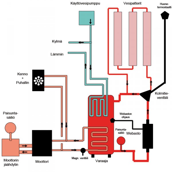 Moottorin ja varaajan välissä tosiaan voisi olla tuo venttiili tarpeen, ettei lämpö karkaa kylmään moottoriin parkissa.