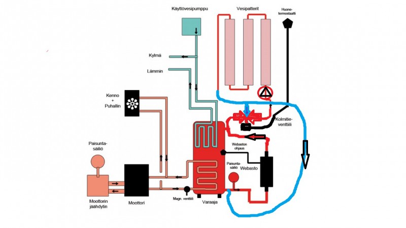 Eli sama järjestelmä, mutta vaihdettaisiin varaaja moottorin kierrosta webaston kierron puolelle. Ajoitko tätä takaa? Silloinhan tosiaan webasto lämmittää vain varaajaa jos tuo termostaatti on kiinni ( eli ohjaa kierron ohi pattereiden ).