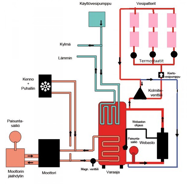 Tässäpä olisi nyt "lopullinen" suunnitelma. Palattiin takaisin tuohon alkuperäiseen huonelämpötilan mukaan säätyvään kolmitieventtiilijä rjestelmään, kun sopivat - ja sopivan hintaiset - osat löytyivät. MMA MTWZ Termostaatti ja MMA EDVH 20 kolmitieventtiili. Kiertovesipumpuksi ajattelin esimerkiksi webaston vesipumppua. Siis erillistä pumppua tuon webaston lisäksi  Parempia ajatuksia? Pattereita olen muutamastakin paikasta kysellyt ja kunhan sopiva määrä löytyy sopivaan hintaan niin täytyy hakea pois. Osaisiko joku arvioida patterimetrien tarvetta? Jokaiseen hyttiin tulisi suunnitelman mukaan kaksi patteria, yksi molemmille puolille. Vesi kiertää aluksi toista laitaa alkaen keskihytistä (kylmin hytti) keulaan ja palaa sieltä toista laitaa takahyttiin. Webaston totesin toimivaksi oikein dieselin kanssa. Purin varmuuden vuoksi koko laitteen, ja karstaa ei paljoakaan ollut. Lienee ollut aika vähällä käytöllä, tai sitten muuten vaan "oikein" käytetty  Onkos kellään kokemusta tuon webaston ohjaamisesta? En ihan heti löytänyt netistä vastaavaa projektia Piirsinkin jo parilla releellä jonkinlaisen ohjauksen tyyliin: - Jos lämmitys päällä, lämpö alle 40 astetta, vesipumppu ei päällä ( = webasto ei päällä ) -> anna käynnistys signaali - Jos lämmitys päällä, lämpö yli 80 astetta, vesipumppu päällä ( = webasto päällä ) -> anna sammutus signaali Täytyy vähän tarkistella asioita, en kehtaa vielä laittaa näytille  Tiedä vaikka tuohon olisi valmis ohjain olemassa...