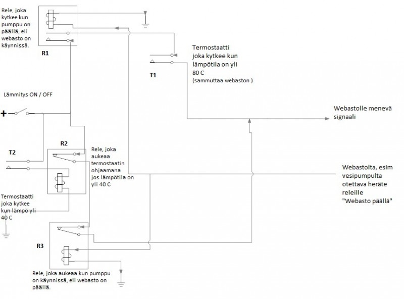 Tämä voi mennä nyt ihan metsäänkin mutta ajatus on seuraavanlainen: KUN LÄMMITYS LAITETAAN ON/OFF KYTKIMESTÄ PÄÄLLE:- R1 rele on auki, koska webasto ei ole vielä käynnissä - R2 rele on kiinni, koska lämpötila on alle 40 astetta - R3 rele on kiinni, koska webasto ei ole vielä käynnissä -> virta juoksee R2 ja R3 releiden kautta webaston signaaliin ja webasto lähtee käyntiin.-> R3 rele aukeaa, koska webasto on käynnissä. -> Signaali katkeaa -> R1 rele menee kiinni, koska webasto on käynnissä. Lämpötila nousee yli 80 asteeseen - R1 rele on edelleen kiinni, koska webasto on käynnissä - T1 termostaatti kytkee, koska lämpötila nousee yli 80 asteeseen -> virta juoksee R1 releen ja T1 termostaatin läpi webaston signaaliin ja webasto sammuu-> R1 rele aukeaa, koska webasto on sammunut. -> Signaali katkeaa -> R3 rele menee kiinni, koska webasto on sammunut Järjestelmä jää odottamaan lämpötilan laskua alle 40 asteeseen, jolloin T2 termostaatti aukeaa, ja aukaisee R2 releen, jolloin webasto saa taas signaalin -> kierto alkaa alustaTuolla "signaalilla" käytetään siis kellon liekki nappia. Miten tuo onnistuu siitä ei ole vielä tietoa  Eikä siitäkään onko tässä mitään järkeä muutenkaan. Täytynee vähän nukkua ja huomenna katsoa uudestaan, mitä tuli piirrettyä..
