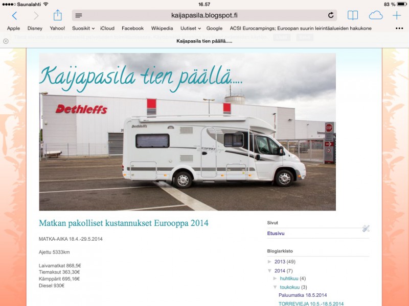 Kiva, kun näistä mun höpinöistä on hyötyä jollekin! Viime vuoden reissun kustannukset löytyy arkistosta 2013 kesäkuu. On kyllä jännä, miten sama tuo hinta oli näillä kahdella eri reissulla. Tiemaksut oli Kroatian suuntaan halvemmat. Kämppärit varmaan suht samaa keskihintaa molemmissa. Viime kevään reissu oli ensimmäinen Eurooppaan ja kyllä se jollain tavalla jäi ainutkertaisena mieleen. Ei tältä toiselta reissulta palatessa tullut mitään haikeita fiiliksiä. Mutta nyt reissun tarkoituskin oli eri. Ruokia ja juomia en uskalla laskea, mutta onhan ne paljon halvemmat kuin kotimaassa. Hyviä viinejäkin sai Espanjassa tyyliin 1,3€/pullo. Ja "huttusta" noin 80centtiä per litra. Siihen sitten fifty/fifty jotain spriten tyyppistä, niin taas meni aurinkoinen iltapäivä rattoisasti!  Kyllä mä suosittelen kelle vaan Europpan reissua. Mulla on sellainen puolinainen lukion kielitaito (englanti, vähän ruotsia, surkeeta saksaa, olematonta ranskaa ja pari sanaa epsanjaa) ja Pasi on nippanappa selvinnyt kansakoulusta, mutta hyvin pärjättiin. Monessa paikassa vastapuoli puhui omaa kieltään ja mä jotain englannin ja maan kielen sekoitusta. Ihan ok! Mutta perusasiat, kuten leiriytyminen ja ruokailut ravintolassa onnistuu varmasti, vaikkei osaisi mitään ulkomaankieltä. Kyllä mä mietin etukäteen, että pitäiskö guugle-kääntäjästä tallentaa valmiiksi lause: "Hei! Tulemme Suomesta. Meitä on 2 henkeä ja asuntoauto. Haluamme sähköpaikan"  Tän olisi voinut tulostaa kaikilla tarpeellisilla kielillä!