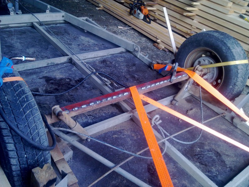 Eli kärry nurin, liinalla laudat kärrinkumeihin kiinni ja kuormaajalla sekä liinoilla painamalla suoraan pöngäten ja mitaten laudan etäisyydet eri asennoissa..