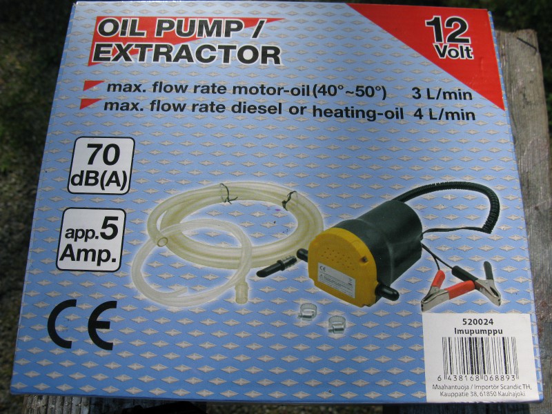 Löytyi huohotin. Pelkkä hattu irtosi ja reiästä tuon imupumpun ohvempi letku sisään ja pumppu käyntiin. Öljyt meni alle viiden minuutin tuolla pumpulla.