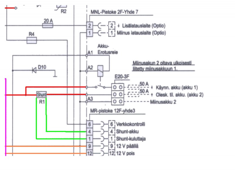 Tarkoitan EBL:n takapaneelia jossa on iso ruuviliitinrima. Siinä on molempien akkujen jännite ja maat.