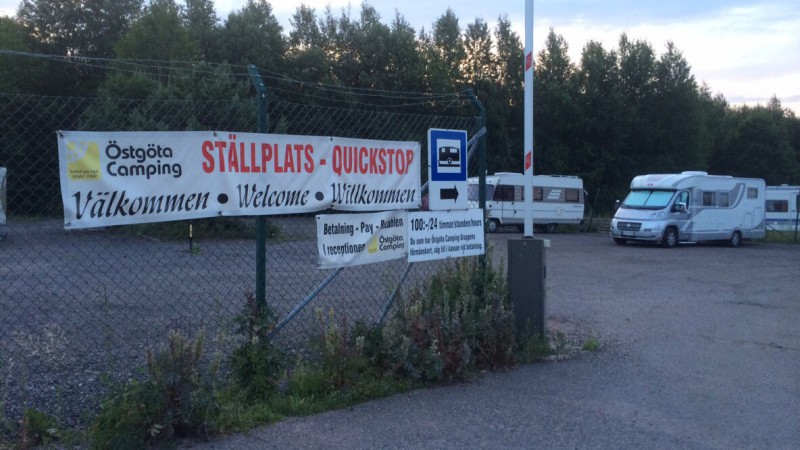 Jos näin kotimaantallaajan silmin tuota E4-moottoritietä katsoo niin äkkiseltään tulee mieleen Turku-Helsinki-Tampere moottoritiet pitkine loivine kaarteineen, nousuineen ja laskuineen. Reilun kolmen sadan tylsän kilometrin jälkeen löydettiin sopiva yöpymispaikka Östgöta Camping ställplatsilta joka lienee sitten puskaparkin ja leirintäalueparkin välimuoto, kemssan ja harmaavesisäiliön tyhjennys onnistuu ja paikalla on myös posliinipönttökin, vuorokausihinta 100 kruunua joka on n. 11 euroa.