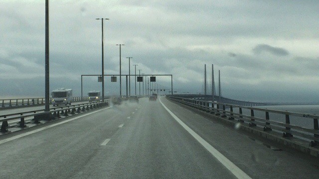 Sade jatkui aina Malmöön asti jossa pyörähdimme kaupungilla vajaan tunnin ajan sateesta huolimatta, Juutinrauman sillan myötä tullimaksu olikin uusi kokemus  (720 DKK = 98 €) joka sujuikin näppärästi jonottamatta joten sillalle ajaminen jatkui sekin vesisateessa joskin pyyhkimet saattoi jo pudottaa tihkulle.