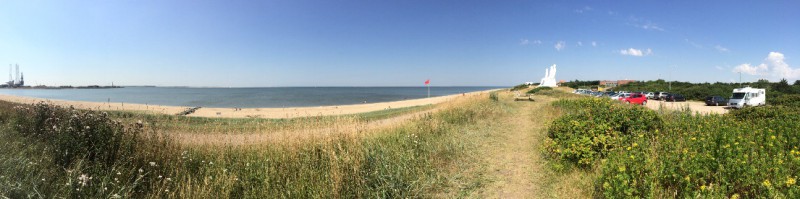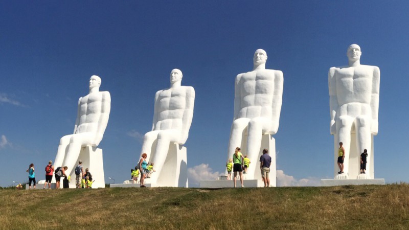 Tankkauksen jälkeen etsittiin hiekkaranta jossa lapset voisivat uida ja löydettiinkin autoliiton Ruotsin ja Tanskan oppaasta yksi Esbjergin nähtävyys eli yhdeksän metriset, neljän miehen patsaat rannalta (Mies kohtaa meren).