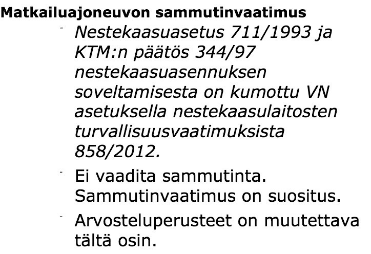 Käsitykseni mukaan ne mahdolliset (onneksi harvinaiset) vaunupalot syntyy joko sähkö- tai kaasulaite vioista. Ja niitä ei kyllä sammuteta "taskumatin" kokoisella sammuttimella, ei varsinkaan jos tulevaisuudessa se "pottu" kulkee isältä pojalle ilman tarkastusta. Olisiko turvallisuusnäkökul masta katsottuna tärkeänpää koeponnistaa kaasulaitteet, vaikka se lisääkin meille kustan- nuksia. Ehkäpä siitä turvallisuuslisästä kannattaa pikkaisen maksaakin.