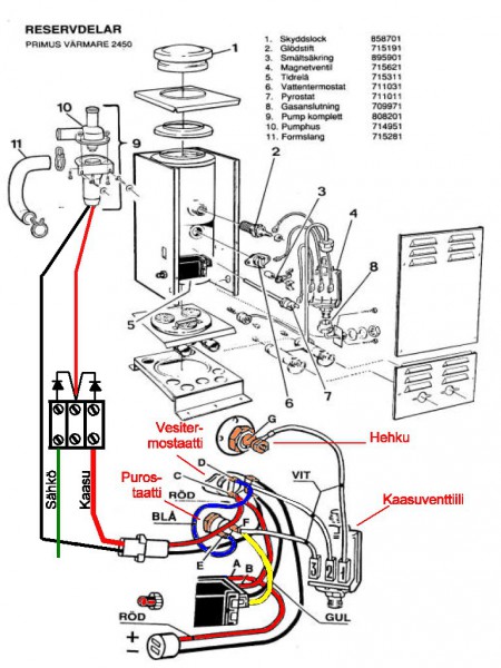 Kerro vähän tarkemmin, nyt ei mennyt minulla jakeluun. Pumppu kytketään pannun kyljessä olevaan liittimeen tai ruuviliitinrimaan.