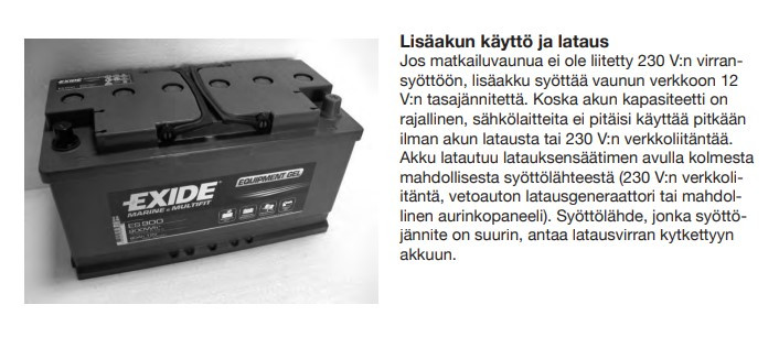 Nyt olisin hankkimassa 2013 mallin Hobbyä nk omavaraisuus paketilla, imeisesti tuo siis mahdollistaisi paneelin kytkemisen suoraan vaunun omaan säätimeen. Kuten ylläkin on todettu. Lieköhän tuommoiseen mitään järki syytä. Suunnitelmissa olisi, jotta tökkäisin ylimääräiseksi jääneen 85Wp paneelin tuohon ja loput 3kpl 140Wp paneelia sitten oman säätimen kautta akkuun. Mulla ilmanviilennys ratkaisu joka toimii 12V ja imee ~4 - 500W käydessään... Ja edellisissä vehkeissä kompura jääkaappi ollut, niin tuntuu taas ettei sähkö riitä jollei paneelia ole riittävästi... Kun pitää aina olla energian suhteen omavarainen...