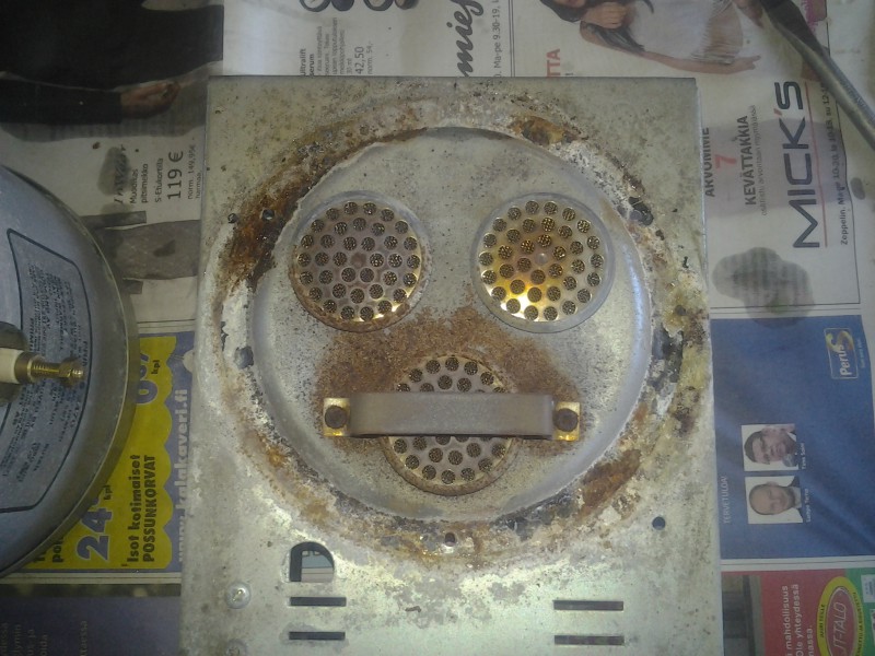Pannun pohja oli tuon näköinen, myös jotain ruostemurakkaa oli sisällä. Putsailin sen ja laitoin kasaan ja ropina ja pauke loppu vaikka polttelin 3:lla polttimella näin kesäkelillä :) Onkohan nuo palopään verkot irrotettavissa, kokeilin vääntää jos olisivat kierteellä ja varovasti koitin myös kammeta meisselillä tuntuvat olevan tiukassa. Tulevaisuuden varalta jos joskus hiekkapuhaltais ja maalais tuon pohjan?