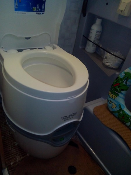 Kasettivessan tarpeellisuudesta voi olla montaa mieltä. Meillä vaunun vessaa käytetään vain satunnaisten yöllisten tarpeiden takia, muulloin käytetään leirintäalueiden, ravintoloiden, huoltoasemien jne saniteettitiloja.