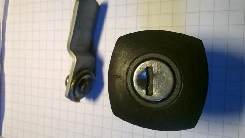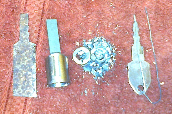 lukko lähtee irti huolto avaimella, siinä on normi avaimen jatkeena suora osuuss, sen voi viilata vaikka sopivasta pellin palasesta käyttäen mallina oikeaa avainta ja noin viis millinen suora osuus sinne etupään jatkoksi. sitten avain lukko pesään ja vääntää lukko aukiasentoon ja vetää pois avaimella koko sylinteri..