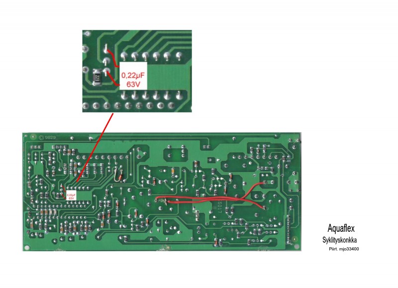 Katkooko vesitermostaatti silti pannua? Ei saisi tehdä niin ja 90 asteinen on liian iso termostaatti. Toimiiko pannun syklitys? Tarkoitan, että käy kolmosteholla 23 sekuntia ja kakkosteholla 1min, tämä toistuu niin kauan kunnes vaunun lämpötilä on lähellä valittua, jolloin käy vain 1:kös ja 2: kos teholla. Jos ei syklitä niin lisää piitilevylle 0,22µF / 63V konkka kuvan mukaisesti.