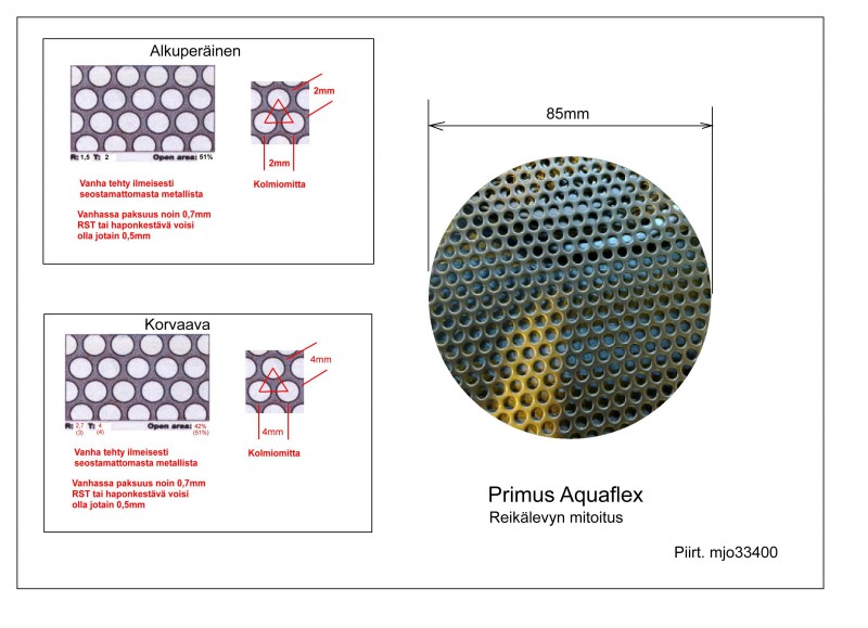 Tutkin muuten saamaani reikälevyä ja totesin reijän olevan noin 1,8mm ja jos on 2mm:n kolmiovälillä ( en vielä mitannut ) niin reikälevyn reijän pinta-ala on liian suuri ja käy kuumana.