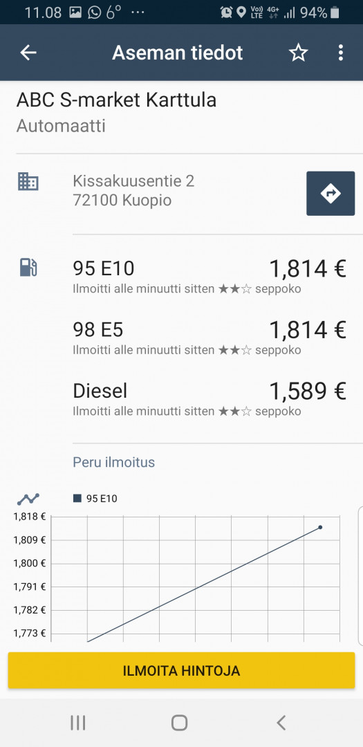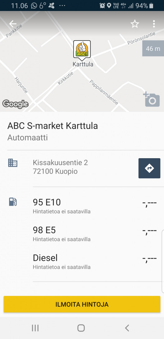 Toinen vastaava on Tankille applikaatio, jota käytän. Se näyttää kartalla asemat ja siinä haluamasi laadun hinnan.