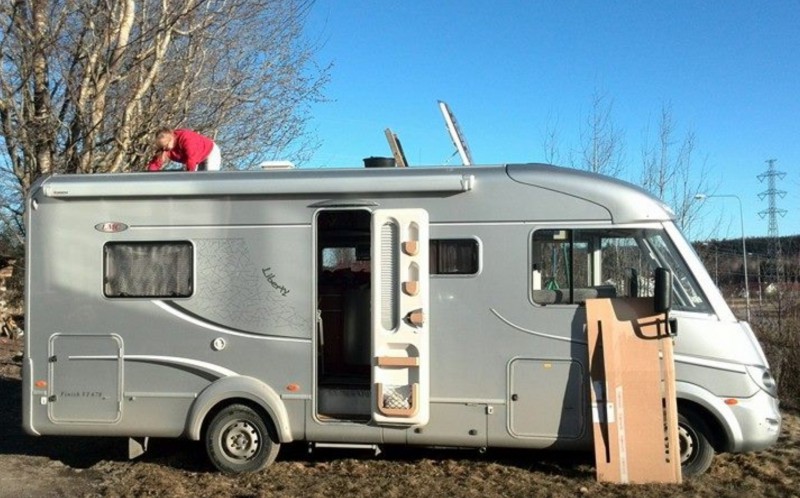 No niin. Minulla matkaaja 9004 katolla sama paneeli(105 W(, Ohjeena seuraava: Polymeerimassalla kiinni katolle(sikamassa myös käy, mutta polymeeri joustaa enemmän).