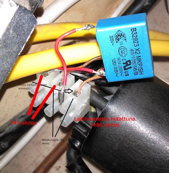Auttaako tämä kuva mitään selvityksessä? Ei auta kun kuva on sähköpatruunasta. Kaasulämmitintä tarkoitin, koska silloin voin neuvoa, että mitä teet. Patruunasta vielä, mittaa sähköpatruunan pumpun moottorin käämit siten, että konkan toinen johto on irti ja kerro mitä lukemia saat niin sanon mitä pitää tehdä. ![]() Tervehdys taas, Kiitoksia tähän mennessä avuista ja jotain on jo tapahtunutkin ![]() Vaihdoin mikrosen konkan testi mielessä -> ei vaikutusta toimintaan. Löysin liitinriman läheltä patruunaa missä oli värit, keltainen, musta, sininen ja katkaistu vihreä johdin ja nämä löytyi myös piirikaaviosta mitkä johti kaasupolttimelle. Joten kokeilin antaa 12v tuohon vihreään ja vot, polttimen pumppu pyörii. Mutta mikrosen konkan vaihdon jälkeen jostain syystä alkoi talon kestosulake paukkua, eli meni patruunan pumppu jostain syystä ilmeisesti oikoseen, auttoi vasta kun näppäsin pumpulle menevät sinisen ja ruskean johdon pois, vastukset kuitenkin lämpenee ja neste kiertää nyt 12v pumpulla joten alkoi hytti lämpeneen lopulta ilman kaasua kuitenkin, eli tuolla nyt pärjää jotenkin, mutta ihan täydellinenhän se ei nyt ole. Kannattaako vielä mittailla noita pumpun arvoja ilman konkkaa vai voiko tuolle enää mitään tehdä? Otat sen shuko töpselin irti rasiasta ja mittaat ne käämit. Se on nyt tärkein asia.