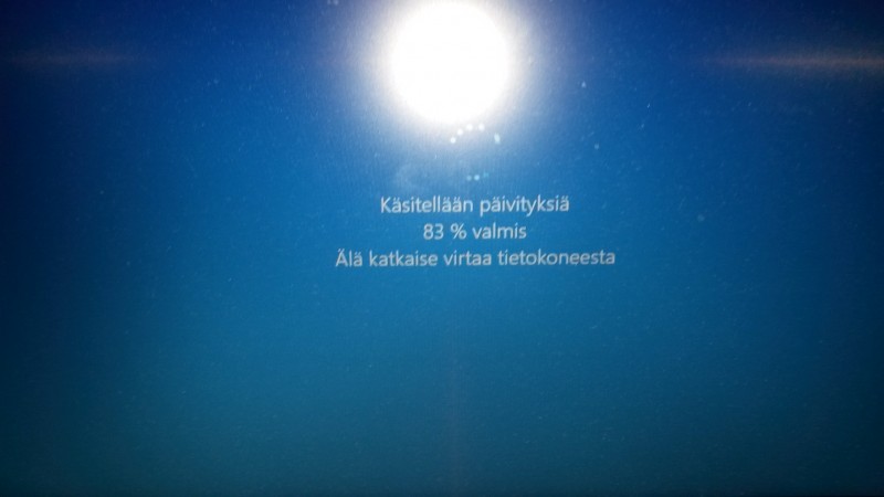 Aamulla kun avasi koneen, niin jäi vain pallura pyörimään, elikä jumiin jäi. 15 minuuttia ihmettelin ja sitten oli pakko buutata. Toisella käynnistyksellä sydän sykkyrällään taas odotin, jotta miten käy. Monta minuuttia meni, ennen kuin pallura sammui. Sitten alkoi vihdoin prosentit juoksee. Sellaiset 20 minuuttia kesti tämä jälkimmäinen aukaisu.