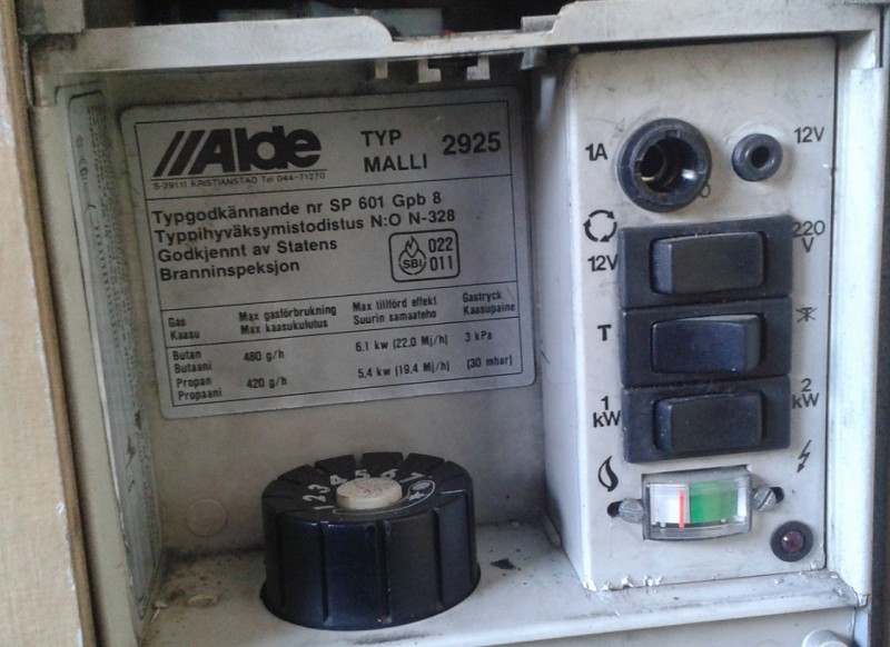Releet on pannun takana pystyssä olevassa patruunassa kotelon sisällä. Edellyttäen että patruuna on pannun takana. Minulla on patruuna kokonaan toisella puolen hyttiä oikean puoleisen lokasuojan päällä. Mutta joka tapauksessa releet on patruunan päällä olevassa kotelossa. Edellyttäen että patruuna on pannun takana. Minulla on patruuna kokonaan toisella puolen hyttiä oikean puoleisen lokasuojan päällä. Mutta joka tapauksessa releet on patruunan päällä olevassa kotelossa. Sinun asennus ei ole alkuperäinen. Sinun asennus ei ole alkuperäinen. Paljon mahdollista, kyseessä on vm. -89 LMC 6400 asuntoauto joka on alunperin ollut varmasti Trumatid lämmpärillä. En tiedä onko Alde asennettu suomessa maahantuojan toimesta vaiko jo valmistusmaassa. Ainakin asennus on tehty ammattimaisesti.