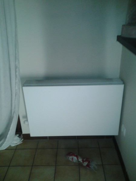 Paljonko lie, laitteen itsensä lämmönvaihdin on ehkä 5-8 l ja siihen verkosto päälle. Ja patterit ovat kuten kuvasta näkyy konvektio mallit. Ja sekin näkyy että aiheuttavat valtavasti ylimääräistä siivousta. Ovat oikeita pöly-imureita. Kerran kahdessa viikossa lämmityskaudella on suojat poistettava ja imuroitava pölyt pois. Monikohan tekee vaunussa saman jossa ollaan pienessä tilassa ja varsinkin talvi aikaan käsitellään paljon tekstiilejä.   Ja ikkunoiden alla on patterit sekä siellä missä ikkunat tai terassin ovet yltävät lattiaan asti on vieressä seinällä. Ja vetoahan tämmöiset mallit aiheuttaa. Tuommoinen iso työntää kuumaa ilmaa ylöspäin kuin truman 6000 kombi kakkos teholla. Eli tämä on juuri se tämmöisen verkon heikous ja vahvuus. Nopea lämmittämään mutta lämpö karkaa katon rajaan ensin eli tehoa menetetään lämmitykseltä paljon sinne missä siitä vähiten tarvitaan. Tuon eron huomaa siitä että olen itse tehnyt takapihan terassin lämpimäksi tilaksi ja siellä on normi levypatteri. Ja aina paljon lämpimämpi kuin muu talo vaikka yksi ulkoseinä on vain kaksinkertaista tiiltä ja yksi lasia kokonaan.