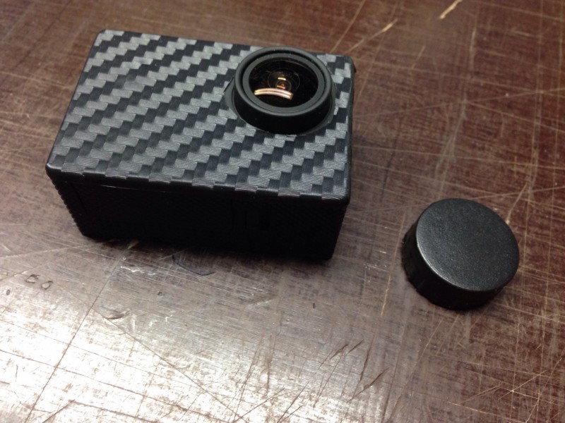 Itseä harmitti, kun kamerapaketin aukaisin, niin toimittivat valkoisella etulevyllä olevan kameran. Näkyy tuulilasilla ulos häiritsevän korostetusti. No asialle piti tehdä jotain...eli hiilikuituteippi pintaan. Myös mietitytti kameran linssin elinkaari autokäytössä, kun sukelluskoteloon en jaksa autossa kameraa jatkuvasti laittaa, enkä myöskään tuulilasilla säilyttää. Hotakoppaan vähän virkistystä (Laphroaig 10yrs) ja hetki esineiden mittailua, niin ratkaisuksi löytyi SodaStream kaasupullon korkki, josta leikasin korkeudesta noin puolet pois ja kun valkoinen väri ei siinäkään miellyttänyt, niin ruuttasin plastidipit pintaan ja ongelma oli korjattu...