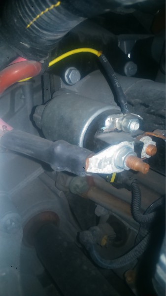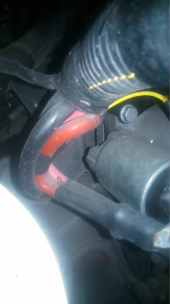 Piti se omassa käydä kattomassa mikä tilanne. Laturi ja startin solenoidi melkein koskettavat toisiaan - ei ole kuin vajaan 20cm kaapelin pätkä välissä.. Ilman tuota mutkaa riittäisi laturilta tuleva lyhyempikin (jos oman kengän sille haluaa tehdä)