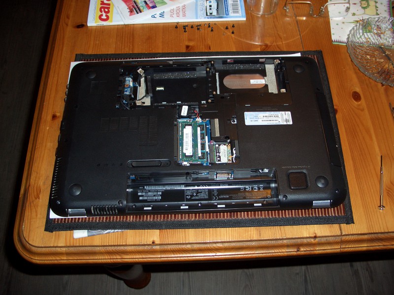 Siitä lähtee levy missä virtakytkin irti , sitten näppis , näyttö kaapeleineen , sitten välirunko , sitten emo. Tuuletin on emon ja pohjan välissä.