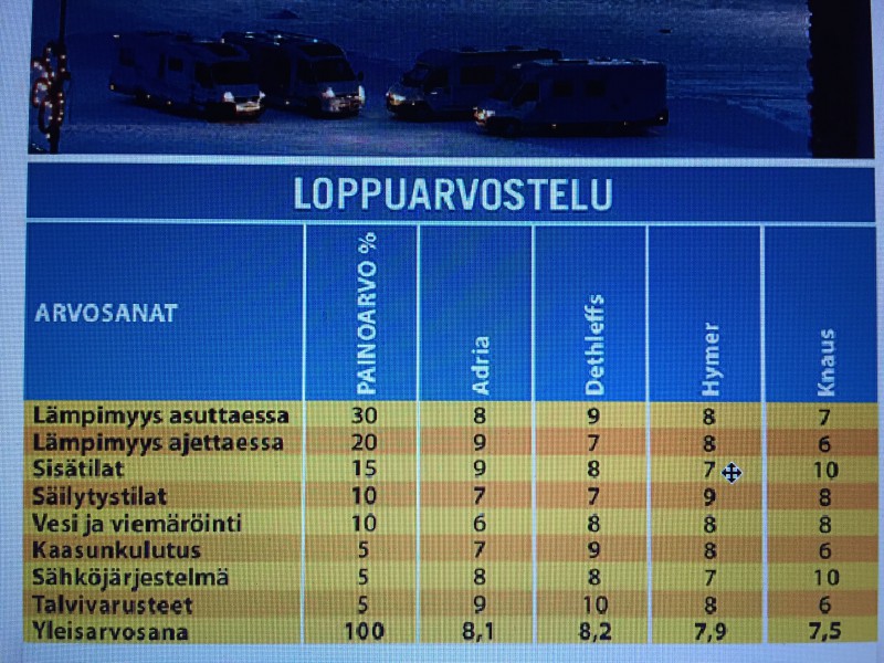 Kannattaa tosiaan tutustua tuohon vertailuun. Edelle kirjoittamani näkyy todellakin pitävän paikkaansa. Tästä pistetaulukosta selviää pisteet ja painotukset sekä se, mistä syistä järjestys on tuo. Huomionarvoisinta on, että koeajohymerissä ei ollut lattialämmitystä eikä Knausissa sähkö"patruunaa". Eli puhdas yksilökysymys. Vertailusta ei ole siis mitään apua erimallisen ja varusteisen auton vertailussa, eli merkkejä ei sen perusteella järjestykseen saa. Tästä taas opittiin, että lähdekritiikki on tärkeä asia. Kannattaa luottaa esim. Promobilin vertailuihin, mahtavat saada helpommin yhteismitalliset autot käyttöönsä.