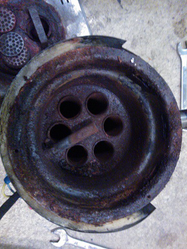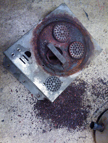 Tulihan sitä aikaa purkuhommiin.. Aika pehmosen näköistä on pannun sisätiloissa. Ei taida pystyä reparoimaan toimivaksi? Tuo keskipiippu on miltei irti tuosta pohjasta. Ei tullu silloin kokeiltua sitä, ku oli vielä vaunussa kiinni. Ja onko tuo sitten se arinaverkko, joka on irrallaan tuossa tuo pieni lätty. Miten lie tuon pönttö-osan kunto, jos hommailis uutta pohjaa? Ruosteessahan tuo on, mutta veet pysyy kuitenkin oikeella puolella.