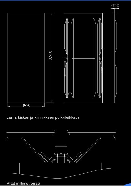 Monikidepaneeli on kehikossa kiinni ja päädyissä kiskot, jotka ovat massalla katossa. Itse paneeli on irti katosta. Mulla paneelin alla on jotain 2-3 cm tyhjää tilaa ja siellä alla sateensuojassa on läpivienti katosta. Paneelin alta voi jopa pestä matalalla lastalla ja suihkulla. Ohutlevypaneelin kiinnityksestä ei minulla ole tietoa.