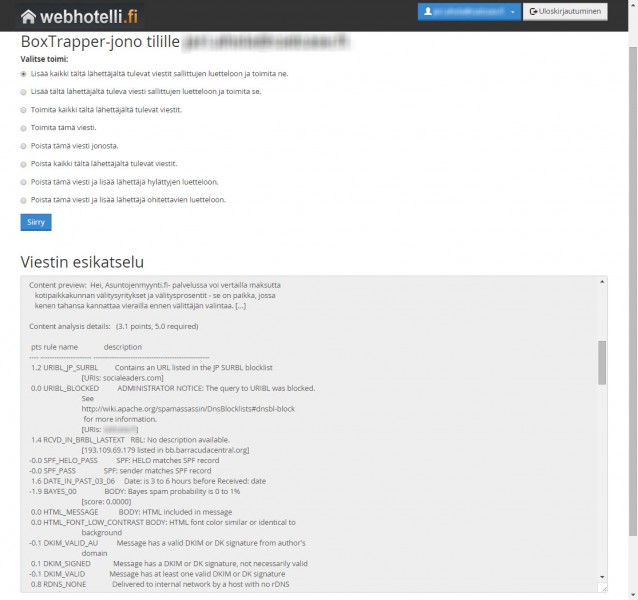 Eli palveluntarjoajalla BoxTrapper, joka tietyn heurestiikan mukaan pisteyttää tulevan "ei valkoiselle listalle" kuuluvan viestin. Säädettyjen rajojen mukaan luokittelee spämmiksi, tai jos lähettäjä, domain tai ip kuuluu kansainv. mustille listoille - blokkaa myös.. Itse voin hyväksyä, hylätä, ohittaa, blokata. Kaikki ihan selainliittymällä palvelimeen.