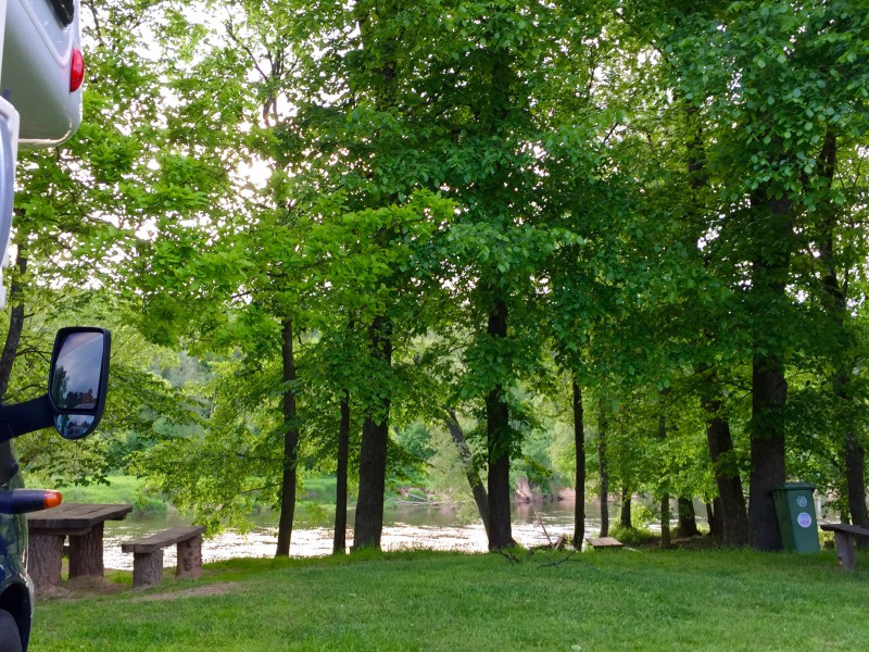 Jatkettiin rantaa alas, ja käytiin rannalla sekä lintutornilla. Oli muuten tietöitä heti Latvian puolella. Varmaan kahdeksat liikennevalot, kun oli vain yksi kaista käytössä. Aikaa paloi odotellessa ja liikenteen hidastumisen vuoksi varmaan tunti yhteensä. Juuri ennen tätä Siguldan joenrantakämppäriä käytiin vielä tutustumassa Birinin linnaan. ![]() Livekuva nyt. ![]() Mutta ei tule työ laki voimaan levoista