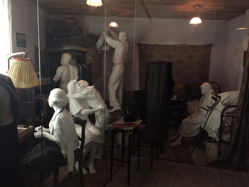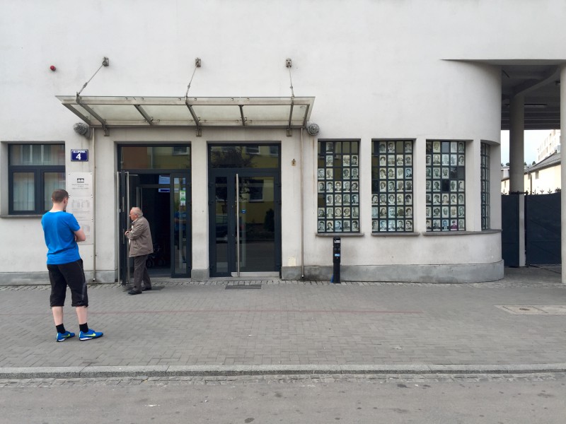 Juutalaisgheton ahtautta. Valkoiset patsaat kuvaa edesmenneitä asukkaita.