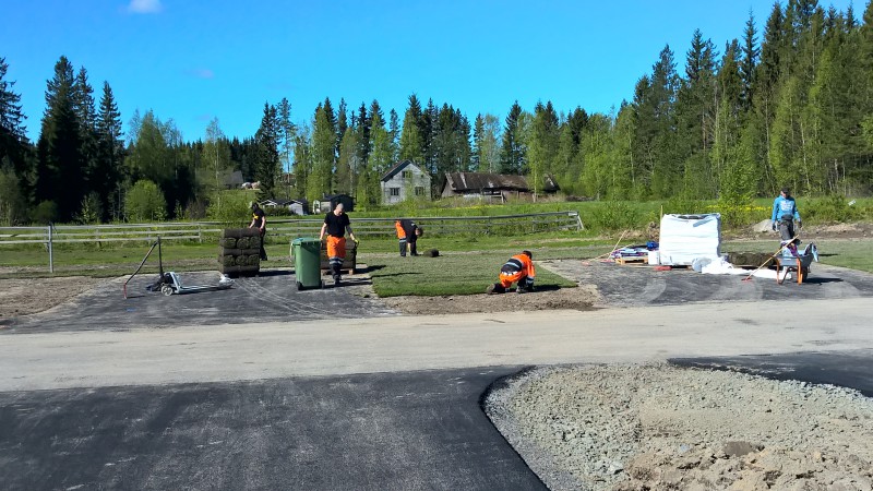 Tuurin onnelan laajennus valmistuu. Nurmikkoa rullataan paikoilleen. Piki jo vedetty