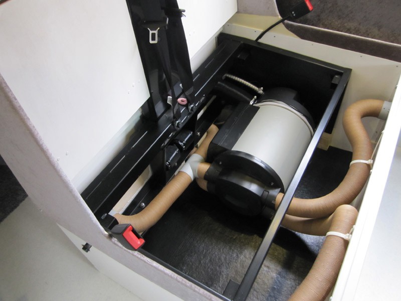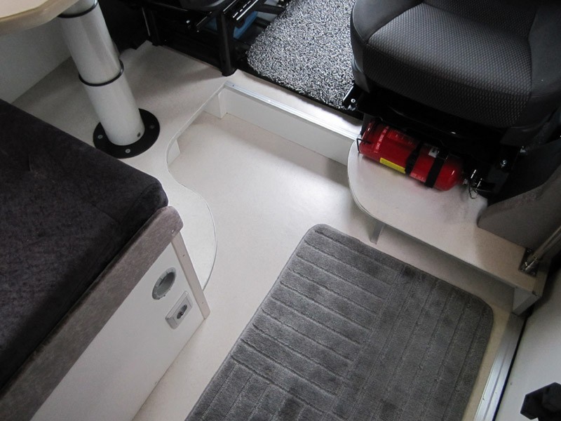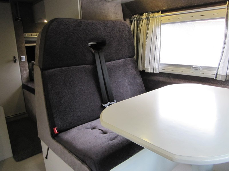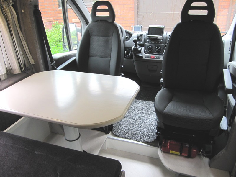 Päivitystä projektin tilanteeseen, tapahtumia vuodelta 2012.  Etuistuinryhmä, pöytälevy 28 mm tammea, pöytä liikkuu auton pituussuunnassa 19 cm ja leveyssuunnassa 21,5 cm, tarvittaessa laskeutuu alas kaasujousen avustamana. Apumiehen istuimen alla 40 mm madallettu alusta, joten kääntölevy ei nosta istuinkorkeutta.  Istuimen selkänojan ja istuinosan kallistus säädettävissä istuinmukavuuden parantamiseksi.  Istuinlaatikossa Truma Combi 6 D diesellämmitin ja tilavaraus ilmastointilaitteel le.  Käytävä ja jalkatila muotoiltu siten että seisomakorkeus säilyy ohjaamoon saakka.  Jalkatilaan jää paikat kahdelle vetolaatikolle 23 x 78 cm ja 21 x 55 cm, korkeus 12,5 cm.  Seinällä pöydän yläpuolella yläkaappi, ovet 16 mm MDF-levyä. Lisää kuvia rakentelusta tulossa.
