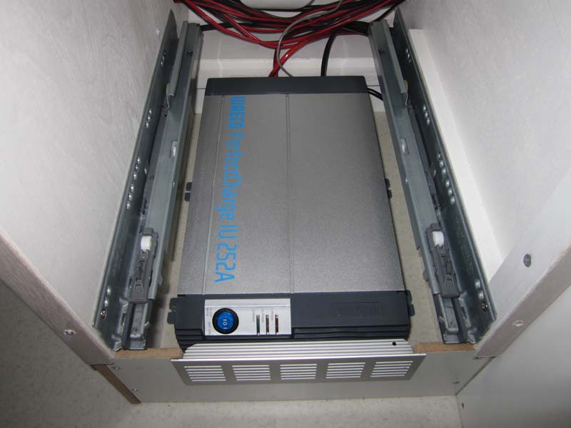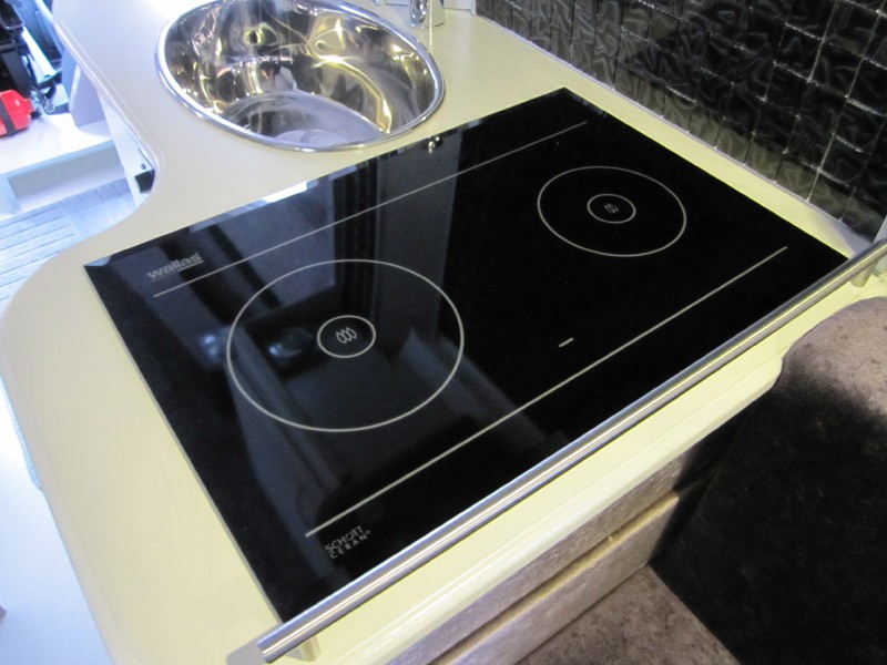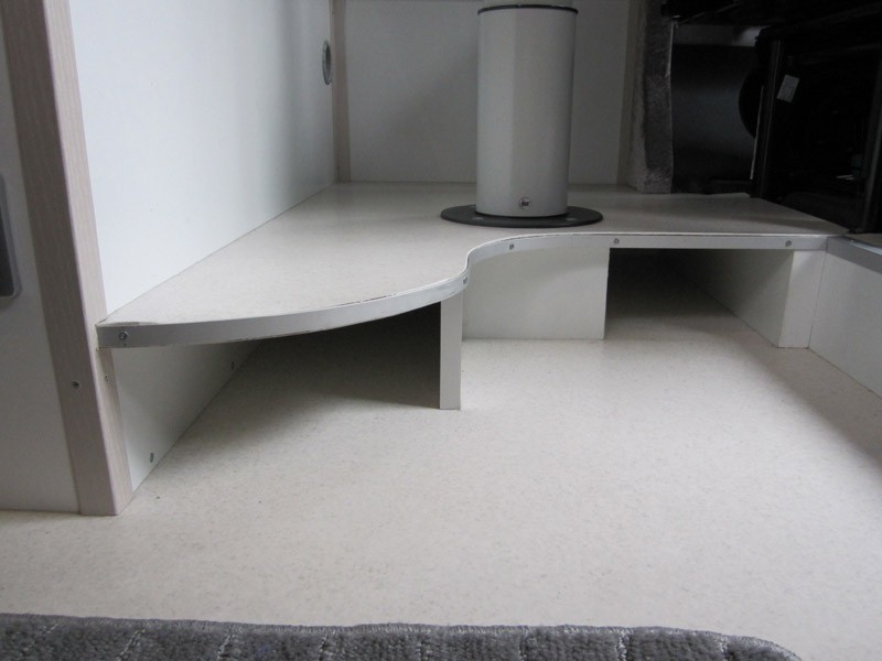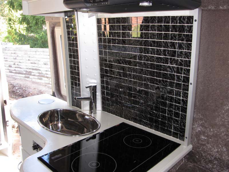 Kuvia keittotiloista.  Keittiötila auton oikealla sivulla liukuoven jälkeen. Alakaappi ja vetolaatikot, laatikot normaaleja metallisia keittiölaatikoita, etulevyt 16 mm MDF. Kaapin päädyssä antennipistorasiat, 12 V ulosotto ja akkulaturin paneeli. Yläkaapit, leveys 70 cm.  Liesi Wallaksen DU88 keraaminen taso, käyttää dieselpolttoainetta ja vähän sähköä. Kaide lieden ja vuoteen välissä.  Välitila laatoitettu lasimosaiikkilaatoi lla. RST pesuallas ja hana,  Laatikoston sokkelissa Waecon 25 A akkulaturi, yöksi laturi voidaan hiljentää ohjauspaneelista latausvirtaa pienentämällä, tällöin jäähdytyspuhallin ei käynnisty. Akun kyljessä vielä lämpötilavahti estäen liian lämpenemisen. Lopullista laskelmaa kustannuksista ei ole vielä tehty, mutta kokonaissumma auton hinta mukaan lukien on noin 50 - 60000 €. Jonkinlainen jaottelu kustannuksista tulossa lähiaikoina. Vc tiloista ei ole nyt kuvia, mutta idea on se että kiinteä vc-istuin Thetford C 403 on kiinnitetty liukukiskoilla ja säilytetään vuoteen jalkopäädyn alla ja otetaan esille vasta hädän yllättäessä. Vapaa lattiatila on näin 80 x 80 cm. Normaali pesuallas ja ovet kaappeihin, jotka ovat vuoteiden päätyjen yläpuolella. Yläkaappien saranat ovat Hahlen Aventos saranoita, oikea tyyppi on HK-S, näitä on saatavilla kalustemyymälöistä esim. Kalustetukku. Hinta noin 60 € pari, siksi kaksi ovilevyä on saranoitu yhdellä saranaparilla.  Pistorasiat voidaan painaa tason alle kun niillä ei ole käyttöä.