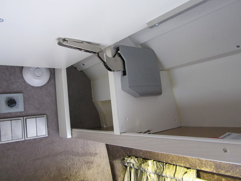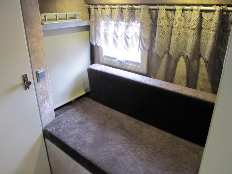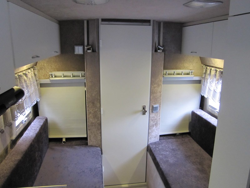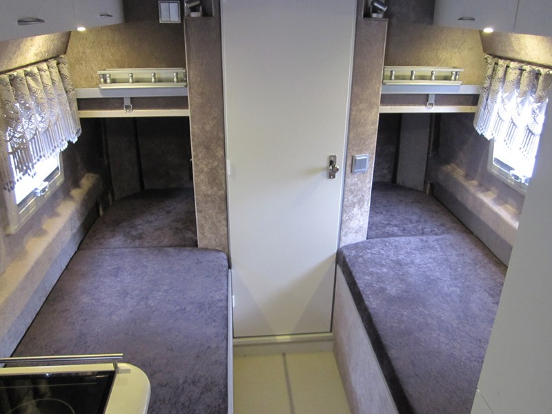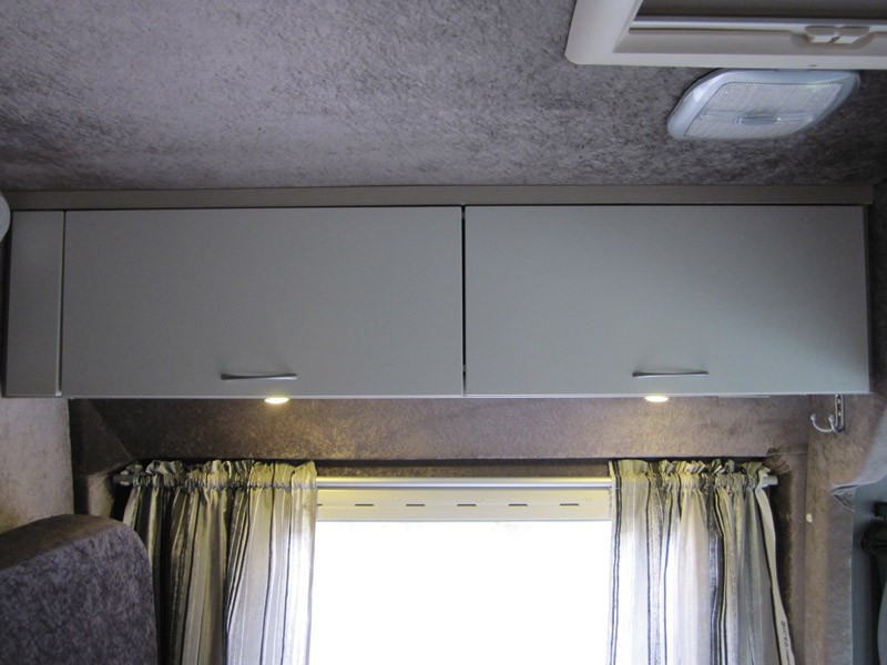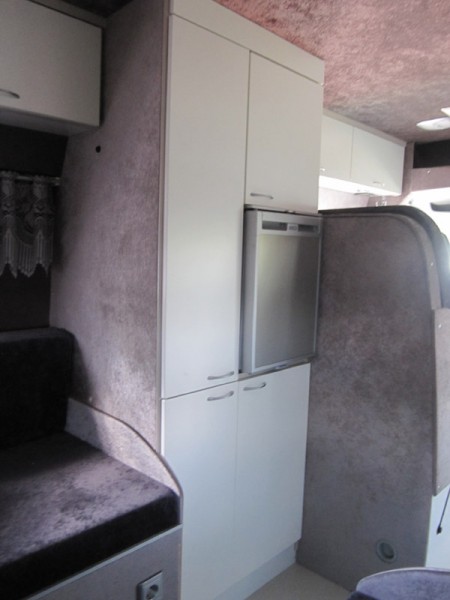 Lisää kuvia.  Istuinryhmän takana auton vasemmalla sivulla korkea vaatekaappi, kaksi pienempää kaappia ja jääkaappi. Kaapiston syvyys 60 cm. Jääkaappi Waecon 12 V kompressorikaappi, tilavuus 50 litraa ja sähkön kulutus 20 asteen lämpötilassa alle 1 A. Kaapissa on ruhtinaallisesti tilaa litran maitotölkille, voirasialle ja 0,5 l oluttölkille.  Auton takaosassa pitkittäiset vuoteet molemmilla sivulla, vuoteiden mitat 190 x 72 cm. Käytävän keskellä VC-tila 80 x 80 cm. Tämä kaventaa jalkopäästä vuoteiden leveyttä.   Kun vuodevaatteet kasaa jalkopäähän, vetää verhon eteen ja laittaa selkätyynyt paikoilleen niin takaosaan saadaan istuinryhmä neljälle.  Vuoteiden yläpuolella on myös samanlaiset yläkaapit. Kaksi ovilevyä on yhdistetty ja saranoitu yhdellä saranaparilla.  Saranoissa, Aventos HF, on säädettävä nostovoima sekä sulkeutumisnopeus oven painon mukaan. Pieni jousivoima vielä pitää oven suljettuna ajon aikana.