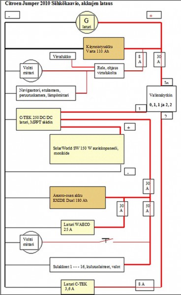 Tässä tämänhetkinen kaavio akkujen latausjärjestelmäst ä.  Akkujen väliin on laitettu mekaaninen valintakytkin, josta voi valita tilanteeseen sopivan systeemin. Esim. valinta 2 on hyvä talvella kun auto on vain päivittäisessä käytössä niin auton generaattori lataa vain käynnistysakkua. Moottorin ja ohjaamon esilämmitys hoidetaan 5 kW Webaston avulla, siksi tarvitaan hyvässä latauksessa olevaa akkua. Verkkovirralla Ctek 3,6 A hoitaa käynnistysakun ylläpitolatauksen auton seisoessa. Asunto-osan AGM akku ei paljon itse purkaudu eikä siten vaadi latausta, aurinkopaneelista voi kuitenkin pientä virtaa saada talvellakin lataustilan ylläpitoon.