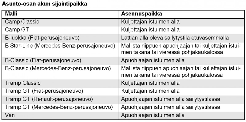 Jos jollekin muulle on tästä apua niin tässä sijainti. Se löytyy lattian alta, asunto-osan oven etupuolella olevan tarvikeluukun takana olevan kotelon lattian alla. Samaan koteloon pääsee toki sisältäkin oikean puoleisen sohvan alta. Akuille on lattian alla olevassa kotelossa kaksikin paikkaa, itselläni on vain yksi 90Ah akku joten varmaan tarvitsee sovittaa siihen vierelle toinen samanlainen geeliakku.
