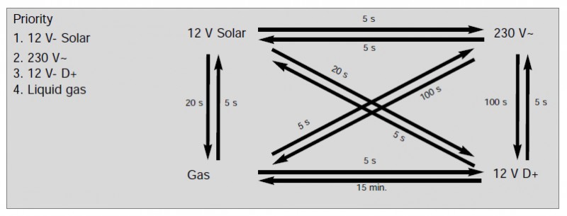 Voisikohan tuota huijata invertterillä? Syötää kaapille hetken 230VAC ja sehän siirtyy 12V>230VAC 5s viiveellä, sammuttaa invertterin ja kaappihan siirtyy 230VAC>kaasu 100s viiveellä = huomattavasti nopeammin kuin 15min viive :P