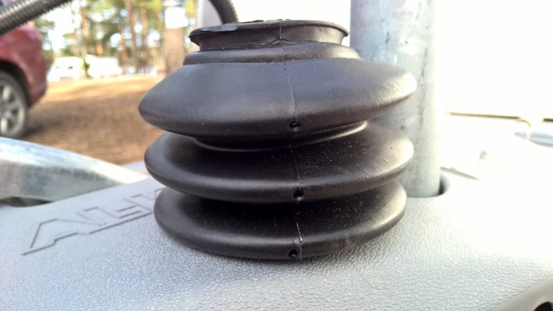 Aurinko ja aika oli tehnyt tehtävänsä vetopään suojakumille. Tässä parhaillaan kun talvilomaa vietän, päätin suorittaa homman itse. Suojakumin hain jo aikaisemmin Hyvinkää Caravanista.