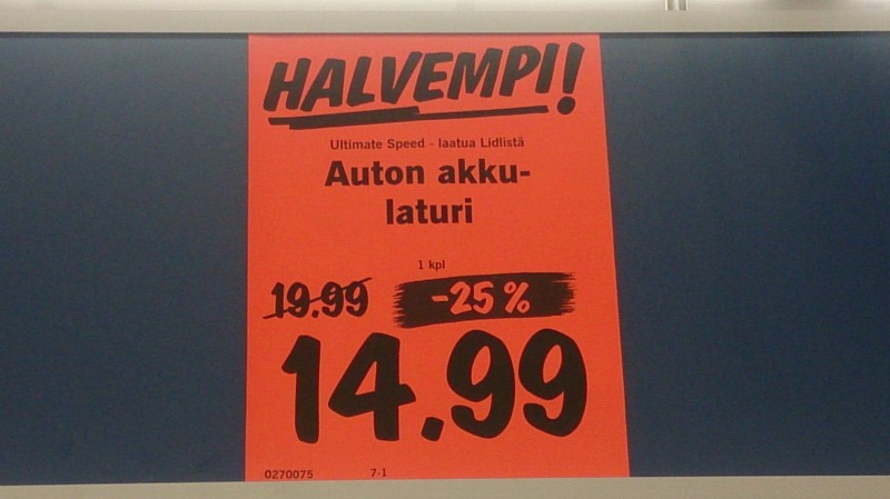 Minulla varmaan lienee samanlainen Puolan Lidl'istä ostettu, noin 2 vuotta sitten. Olimme Puolassa, matkalla Espanjaan. Täydensimme auton jääkaappia kyseisessä liikkeessä kun huomasin laturin mainoksen roikkuvan myyntipöydän yläpuolella. En voinut jättää ostamatta kun hinta oli kokonaiset 13 euroa.
