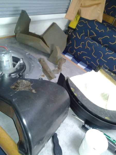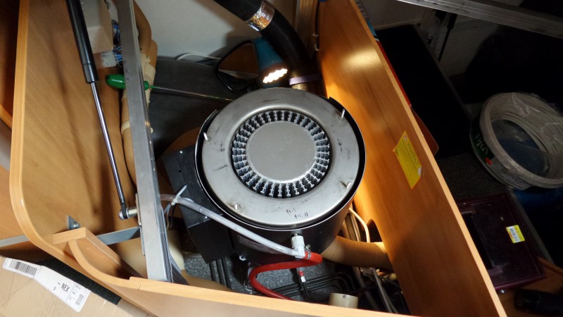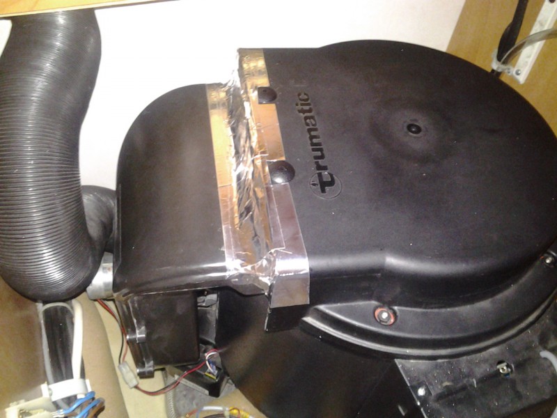 Tuo koko puhallinkotelo olis järkevintä olla esim. alumiinia tai peltiä. Mutta kuten jo aiemmin kirjoitin. Truma Combi on "päivitetty" eri asennossa toimivaksi. http://www.truma.com/downloadcenter/combi_4e_6e_operating_fin.pdf http://www.atstuonti.fi/File/K%C3%A4ytt%C3%B6ohjeet/Truma/C3402%20C4002%20C6002.pdf ![]() Liima oli palanut haperoksi. Käytin imuria apuna ettei rouhe levinnyt. Kuvasta näkee kuinka vaahtomuovissa ylikuumentumisen ruskea väri. ![]() "Saumasin" raot alumiininauhalla. Pannun kannessa eristeet jätin paikoilleen (palovilla ja lasikuitumatto) Laitoin alumiininauhan myös suojaksi puhallinkotelon sisähuuliin. Tarkastin 6kk päästä. Oli vielä ok. Olin juuri hakemassa kahvia, kun pannu oli ylempänä ja kuvaa ei ole. Asentaja sanoi lattiassa olleen muutaman sentia kokoinen pyöreä alue, joka oli hieman väriä muuttanut.