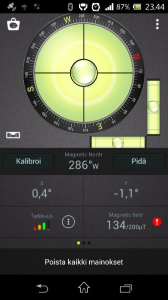 Ei silti, en käytä tuota luurin vatupassia. On semmoinen punainen vaunun kaapissa. Kätevämpi , eikä ole muita mainoksia kuin tuotemerkki. Ei ala B:eellä  ;)