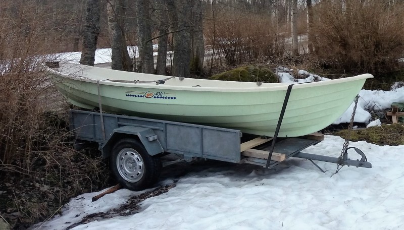 Uusvanhasta peräkärrystä tehty traileri soutuvenelle.  Huomaa, että vene on lukittu kuten asiaan kuuluu.