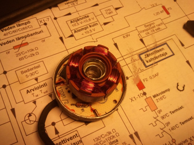 Tuosta saanee vielä lämmityskäyttöön kelpaavan pannun, kun palopesä on ehjä; lämminvesipuoli pitänee ohittaa. Onko sellainen turvallista; voiko tuota pannua käyttää ilman vettä? Tässä paloilmapuhallin avattuna, joten se on korjattavissa. Löytyy myös kytkentä miten uusi kytketään vanhan tilalle, mutta se ei ole koneella, joten laitan sen tänne myöhemmin tänään. Minulla on myös tuollainen vanhempi puhallin jossa on viallinen piirilevy, mutta en ole vielä testannut sitä ilman piirilevyä. ![]() ![]() Näin vanha paloilmapuhallin kytketään uuteen. Kannattaa katkaista vanhan johto aivan puhaltimen juuresta ja juottaa johdot uuden pinneihin ja kutistesukka jokaiseen juotokseen. Kiitos paljon näistä tiedoista. Eiköhän me näillä eväillä saada Sirkan pannu taas kuumaksi. Kun pannu nyt on levällään, voisi varmaan tarkistaa että kipinäkärkien kärkiväli on sopiva. Onko tuohon olemassa tälle pannulle ohjearvoa? Kiitos paljon näistä tiedoista. Eiköhän me näillä eväillä saada Sirkan pannu taas kuumaksi. Kärjet kannattaa ehdottomasti tarkistaa kun pannu kerran pöydällä on. Kärkiväli noin 3-4mm. Kärjet olivat hyväkuntoiset.