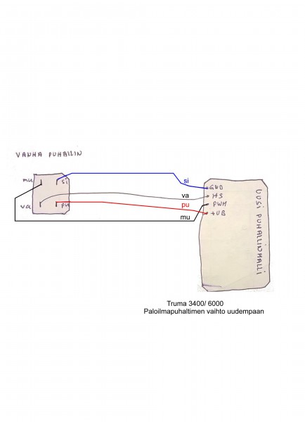 Jos saan hommattua tuohon 6002:n paloilmapuhaltimen, mitä tarvitsee johdotuksissa muuttaa että se toimii tässä pannussa? Tässä näyttää olevan neljä johdinta; kaveri oli sitä mieltä, että 6002:n puhaltimessa olisi vain kaksi. Minulla käytöstä otettu 3402 joka toimii ok, tulossa myyntiin. C 6002 ja 3402 on uudempia malleja tuosta 3400sta ja en tiedä miten osat keskenään vaihdettavissa. Vedettömänä noita voi käyttää