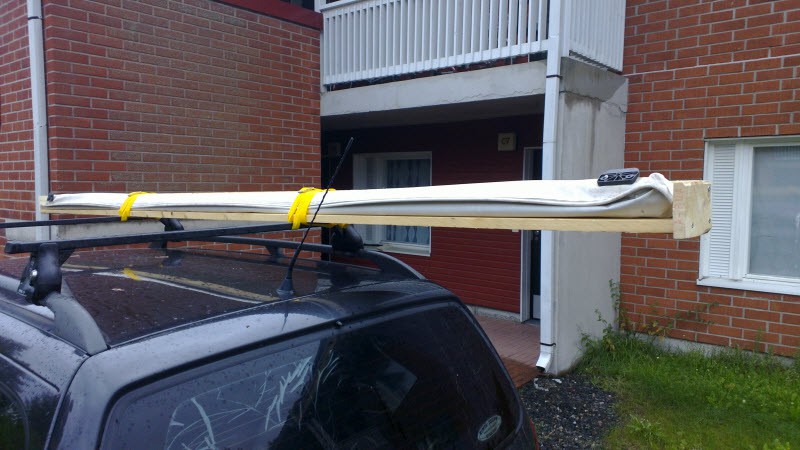 Pussin sisälle ei taida mahtua edes 2x2, yhtenä ajatuksena kävi mielessä sitoa pussi vastaavan pituiseen lautaan kiinni. Ota kax lautaa ja ruuvaa ne L-muotoon. On taatusti tukeva. Itse olen kuljettanut 4 metristä omnistorin pussimarkiisia kiinnitettynä kahdella nippusiteellä auton kattokaiteeseen ilman ongelmia.